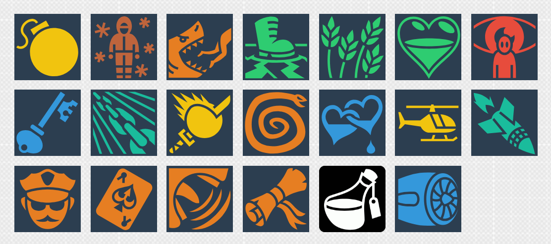 Game-icons.net contém icones em SVG feito pela comunidade, tem lindos ícones para ser usado gratuítamente em seu jogo, e se precisar editar, ele já está vetorizado. Só colocar o autor nos créditos, só isso, nada mais.